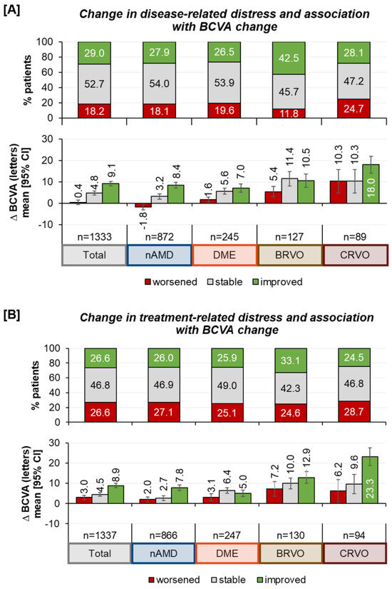Change from the baseline to the final visit for disease-related distress (A) and for treatment-related distress (B) in association with the best corrected visual acuity (BCVA, improved: ≥+5 EDTRS letters; stable: >−5 letters and <+5letters; and worsened: ≤−5 letters).