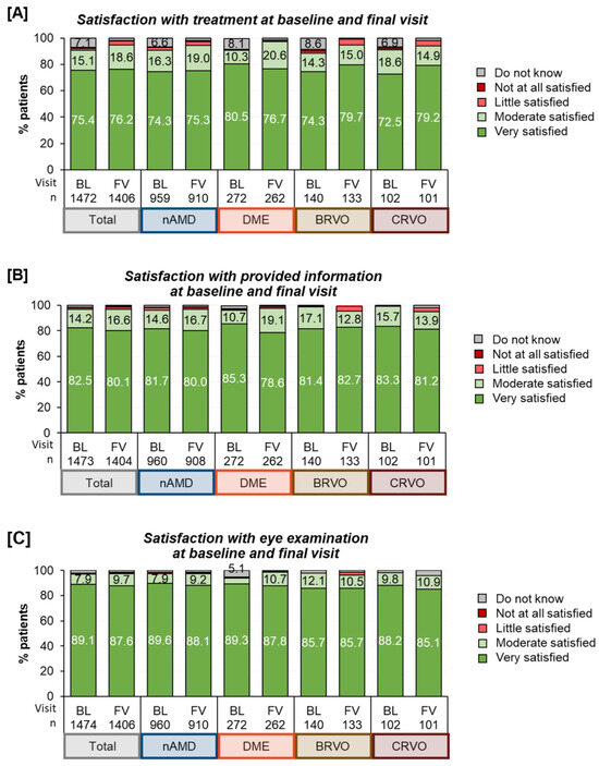 Treatment satisfaction (A), satisfaction with eye and control examinations (B), and satisfaction with information about disease (C) at baseline. Note: For clarity reasons, labels for values <5% were omitted.
