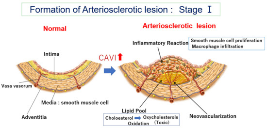 Formation of an arteriosclerotic lesion: Stage Ⅰ. Cholesterol-rich lipoproteins such as LDL, IDL, and small dense LDL are carried by vasa vasorum and enter the deep intimal area. There, cholesterols are oxidized, and several oxidative products are produced. Oxysterols are toxic and damage the surrounding tissues. For example, 7-ketocholeterol induces apoptosis of smooth muscle cells and expands the lipid pool. Then, oxysterols induced an inflammatory reaction, and macrophages infiltrated. Smooth muscle cells migrate from the media to the intima and proliferate to make intimal thickening. During this process, vasa vasorum develop from adventitia into an intimal lesion through the medial smooth muscle layer (neovascularization). The CAVI increases as arteriosclerosis develops. CAVI: cardio-ankle vascular index; IDL: intermediate-density lipoprotein; LDL: low-density lipoprotein.
