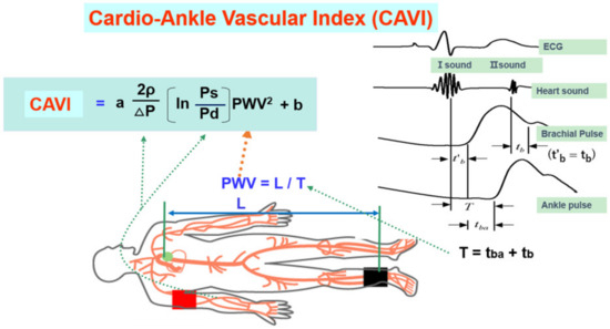 More recently, the cardio-ankle vascular index (CAVI) was proposed as a new arterial stiffness index of the arterial tree from the origin of the aorta to the ankle [14]. The CAVI was derived from the combination of the stiffness parameter β [46] and the modified Bramwell–Hill equation [47], and the formula is shown below (Equation (1)). The notable feature of the CAVI is its independence from blood pressure at measuring time.