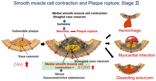 The process of plaque rupture of vulnerable plaque triggered by medial smooth muscle contraction monitored with a rapid rise in the CAVI: Stage II. When a rapid rise in the CAVI was observed, medial smooth muscle contraction occurred. Then, the vasa vasorum are strangled, and blood supply to the intimal lesion is stopped, which causes ischemia and necrosis of vulnerable plaque, following plaque rupture. Cardiovascular events such as cerebral bleeding, myocardial infarction, and dissecting aneurysms in the aorta might happen in the near future (Quoted from Ref. [20]).