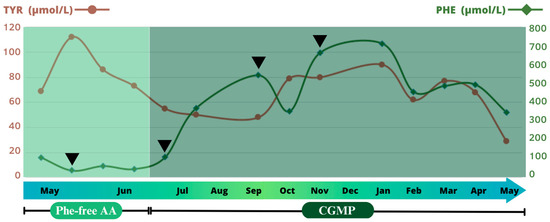 Although the gastric feeding was initially well-tolerated, enabling the maintenance of Phe levels within the European target range for adults (120–600 μmol/L), some episodes of vomiting were reported. Reducing the enteral infusion rate with a feeding pump was sufficient to prevent their recurrence.