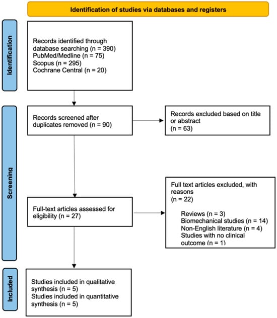 After the initial search turned up 73 relevant articles, 46 abstracts were screened, and 27 full-text articles were evaluated for eligibility according to our inclusion criteria. This led to the identification of five comparative studies that could be included in the meta-analysis (Figure 1). There were 584 patients in all, 294 of whom did not undergo anterior referencing TKA and 290 of whom did not undergo posterior referencing TKA.
