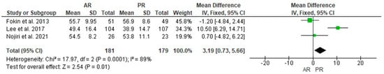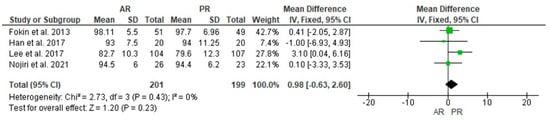 Preoperative KSS was determinated in three studies in 181 and 179 cases in the AR and PR groups, respectively, with a statistically significant difference found in favor of the PR group (MD = 3.19, 95% CI [0.73, 5.66], p = 0.01) (Figure 2); four studies reported postoperative KSS in 201 and 199 cases in the AR and PR groups, respectively, and no statistically significant difference was found (MD = 0.98, 95% CI [−0.63, 2.60], p = 0.23) (Figure 3).