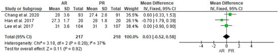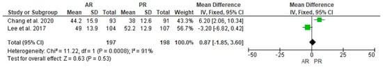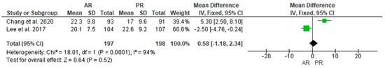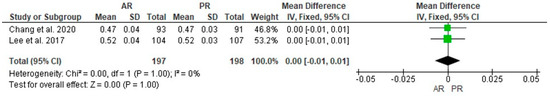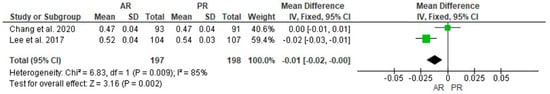 PCOR was calculated preoperatively in two studies in 197 and 198 implants positioned with AR and PR TKA groups, respectively, and no statistically significant difference was found (MD = 0.00, 95% CI [−0.01, 0.01], p = 1.00) (Figure 10). Postoperatively, PCOR was determinated in two studies in the same cases in the AR and PR TKA groups and a statistically significant difference was found with a higher postoperative PCOR in the PR group (MD = −0.01, 95% CI [−0.02, −0.00], p = 0.002) (Figure 11).