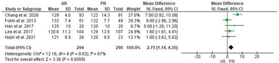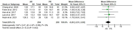 Five studies with 294 and 290 patients in the AR and PR TKA groups, respectively, reported the preoperative ROM, and no statistically significant difference was found (MD = −0.26, 95% CI [−2.51, 2.00], p = 0.82) (Figure 6); postoperative ROM was reported in the same cases, and a statistically significant difference was found in favor of the AR group (MD = 2.75, 95% CI [1.14, 4.35], p < 0.001) (Figure 7).