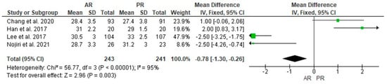 Three studies reported preoperative PCO in 217 and 218 cases in the AR and PR TKA groups, respectively, and was not found any statistically significant difference (MD = 0.03, 95% CI [−0.52, 0.58], p = 0.92) (Figure 8); four studies described postoperative PCO in 243 and 241 cases in the AR and PR TKA groups, respectively, and a statistically significant difference was found with a higher postoperative PCO in the PR group (MD = −0.78, 95% CI [−1.30, −0.26], p = 0.003) (Figure 9).