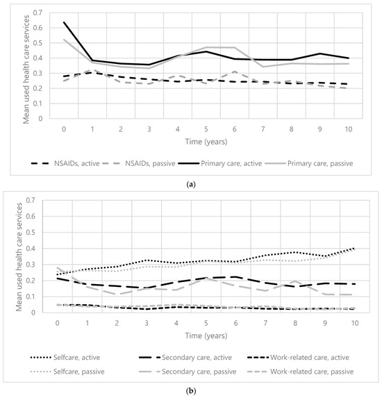 Over 10 years, the mean of all used healthcare services (range 0–20) in participants with an active pain coping style ranged from 1.18 (±1.75) to 1.42 (±1.49), and in participants with a passive pain coping style, from 0.99 (±1.57) to 1.35 (±1.80). Figure 1a,b present the change in the mean number of used healthcare services in all subgroups, for both participants with an active and passive pain coping style. The mean number of used healthcare services was the highest in the subgroup ‘primary care’ in all participants. Used healthcare services in the subgroup ‘self-care’ increased over time, in contrast to the use of NSAIDs, which slightly decreased in both patients with an active and passive coping style. The trajectories of HCU in subgroups ‘primary care’ and ‘secondary care’ over the years are comparable. The course of mean used healthcare services in the subgroup ‘work-related care’ remains relatively stable in both patients with an active and passive coping style.