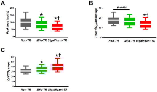 The relation between TR severity and the representative parameters in CPET: (A) peak load; (B) peak VO2; (C) VE/VCO2 slope. CPET, cardiopulmonary exercise testing; TR, tricuspid regurgitation; VCO2, carbon dioxide volume; VO2, oxygen consumption; VE, minute ventilation. * p < 0.05 vs. non-TR. † p < 0.05 vs. mild TR.