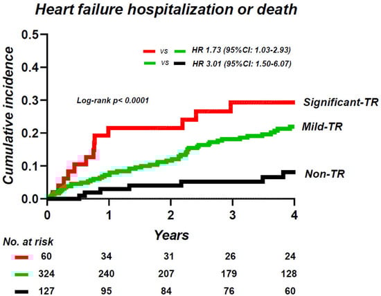 Previous studies have reported that among patients with CVD, those with moderate and significant TR displayed worse symptoms and poorer clinical outcomes than those without significant TR [,,,,,,]. Moreover, a recent study, using the National Echocardiography Database of Australia, demonstrated that even mild TR was independently associated with a significant increase in mortality in individuals who underwent echocardiography with or without CHF []. The majority of patients with CHF have mild TR rather than significant TR; nevertheless, the adverse effects of mild TR in patients with CHF are not well delineated.