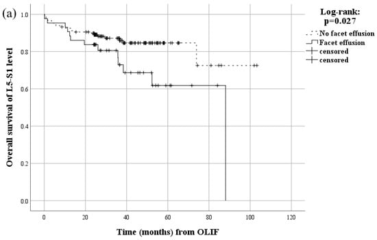 In the survival analysis, patients with symptomatic ASD showed an estimated median survival of 88.1 months (Figure 2). The cumulative 24- and 60-month overall survival rates among all patients were 88.4% and 78.9%, respectively. A significant difference was observed in the overall survival of the L5-S1 level between the group of patients with pre-existing facet effusion and those without (p = 0.027) (Figure 3a). This difference was also evident when comparing patients with and without severe disc degeneration of Pfirrmann grades IV or V at the L5-S1 level (p = 0.031, Figure 3b), as well as between patients with and without severe fatty degeneration of Goutallier grades 3 or 4 in the paraspinal muscle at the L5-S1 level (p = 0.012, Figure 3c).