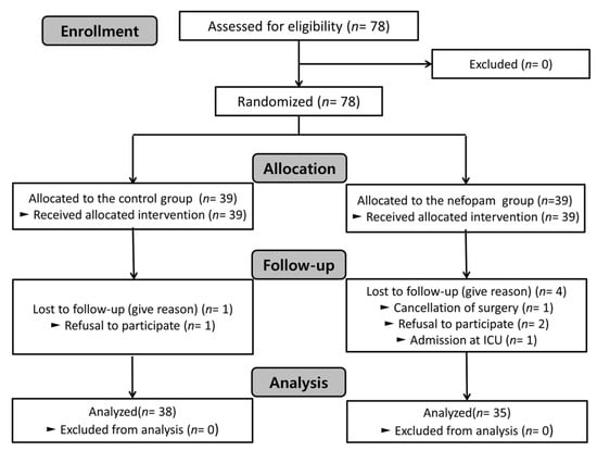 A total of 78 patients were enrolled and randomly allocated to two groups. One patient in the control group (refusal to participate) and four patients in the nefopam group (one due to cancellation of surgery, two due to refusal to participate, and one due to ICU admission) were excluded. Therefore, 38 and 35 patients in the control and nefopam groups, respectively, were analyzed (Figure 1).