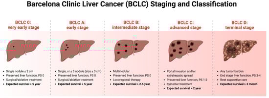 The Barcelona Clinic Liver Cancer (BCLC) staging and classification system is widely used in the management of HCC to guide treatment decisions and predict prognosis. This system takes into account tumor characteristics, liver function, and performance status to stratify patients into different stages (0 to D) and assign appropriate treatment strategies [3].