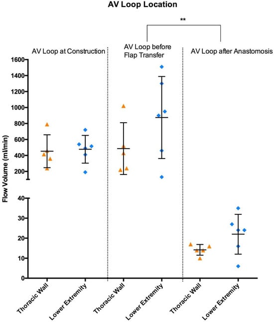 | AV Loop at Construction (AV1) | AV Loop before Flap Transfer (AV2) | After Anastomosis (AA) | After Anastomosis (AA) | Flow AV1 vs. AV2 | Flow AV2 vs. AA | |