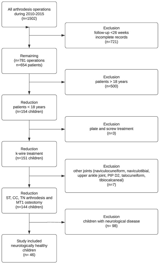 As shown in the following flowchart (Figure 1), the main reason for exclusion was missing X-rays after 6 months. In total, 154 children met the follow-up criteria; in three cases, other osteosynthesis material was used, seven subjects were excluded due to joints other than the TN, CC, subtalar and MT I, and 98 patients had a neurological disease causing the deformity. Therefore, at least 46 subjects were included (Table 2).