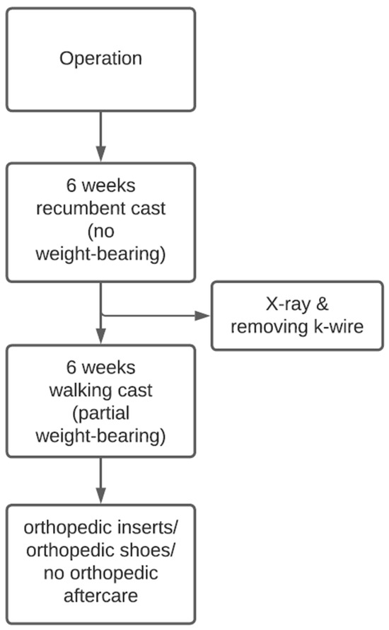 Standard wound checks were performed in our outpatient clinic. For this purpose, windows were cut into lower leg plaster to examine and dress the wounds. To prevent transcutaneous infections from the wires, regular wound checks should be made. Six weeks after surgery, the K-wires were removed. In some cases, local anaesthesia was necessary; wires were removed with pliers. During this appointment, the recumbent cast was changed to a walking cast, which the subjects wore for another 6 weeks. The walking cast allows partial weight-bearing, which should be increased over time with full weight-bearing occurring around the 12th postoperative week. Then, the cast was removed, and depending on the clinical findings, orthopaedic inserts or shoes were fitted in our technical orthopaedics department (Figure 5).