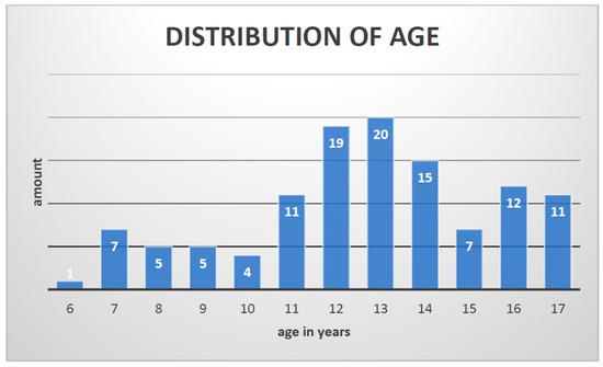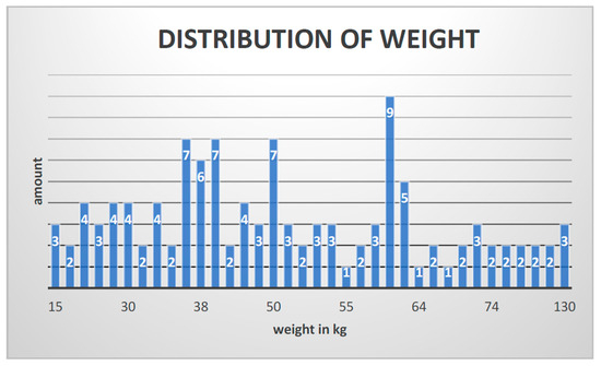 In total, 46 subjects matched the inclusion criteria, and 117 arthrodesis procedures with K-wires were performed. The entire patient cohort was distributed as follows: 70% (81) boys and 30% (36) girls with a median age of 13 years (6–17 y; 12.68 ± 2.815) and an average weight of 50 kg (15–130 kg; 51.01 ± 22.944) (Figure 6 and Figure 7).