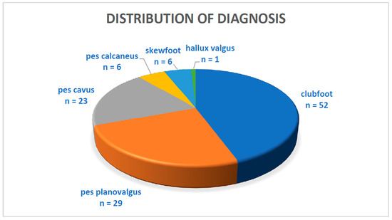 Regarding the distribution of the diagnoses (Figure 8) that led to the indication of arthrodesis, almost half of the subjects had clubfoot (52). The second most common diagnosis was pes planovalgus (29), followed by pes cavus (23), pes calcaneus (6), skewfoot (6) and hallux valgus (1).