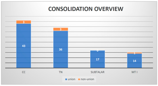 Our follow-up showed that over 94% of the arthrodesis cases healed. Of 117 joints, only 7 showed non-union, 3 TN joints, 3 CCs and 1 MT I (Figure 9).