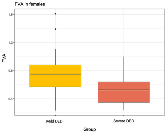 We observed that in women, Severe DED produced a significantly worse FVA of 0.52 ± 0.20 compared to 0.73 ± 0.30 in the Mild DED group, p = 0.006 (Figure 1). There were not enough men in the study to show this relationship (Figure 2) (Table 6).