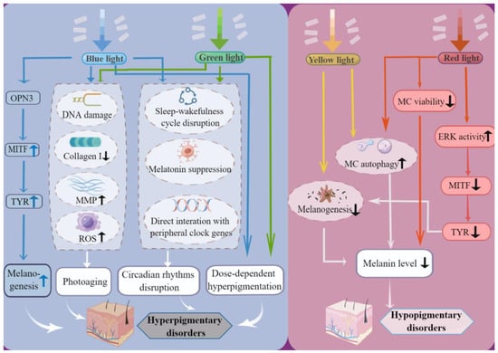 Different regions of the VL spectrum are more likely to contribute to distinct pigmentary disorders. While blue or green light is generally considered one of the significant causes of disorders of hyperpigmentation under most conditions, in some cases, yellow or red light may serve as a crucial facilitator for the development of hypopigmentary diseases (Figure 2).