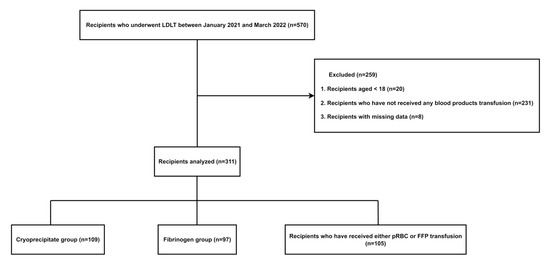 Of the 570 patients who underwent LDLT at our institution during the study period, 364 patients were excluded according to the exclusion criteria. In total, 311 patients were divided into the cryoprecipitate group (n = 109), fibrinogen concentrate group (n = 97), and recipients who received a pRBC or FFP transfusion without cryoprecipitate or fibrinogen concentrate (n = 105). (Figure 1)