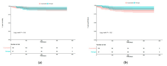 Kaplan–Meier curves of (a) 1-year mortality; (b) 1-year graft failure in the cryoprecipitate group and fibrinogen concentrate group.
