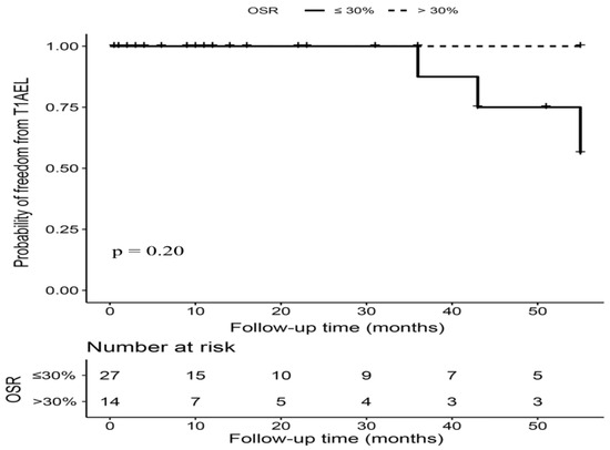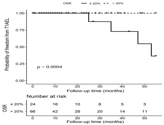 Kaplan–Meier curves of freedom from type IA endoleak (T1AEL) in hemodynamically stable patients with OSR > 20% versus OSR ≤ 20%. Footnote: T1AEL = type IA endoleak, OSR = oversizing ratio.