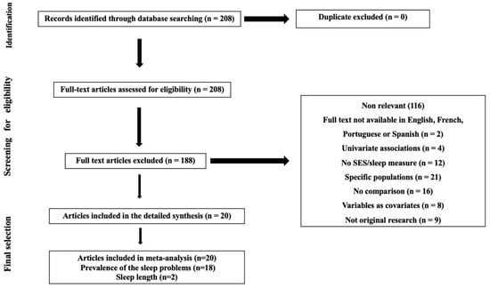 Empirical studies were defined as those of any design (cross-sectional, retrospective, or longitudinal) assessing humans of any gender, race/ethnicity, and age from the general population of any country from Latin America. The article should include an objective or a subjective measure of SES, such as income (monthly personal income, monthly family income, per capita income, and annual household income), educational level, wealth, profession/occupation, employment status, and perceived SES or self-reported SES. Proxy measures of SES, such as neighborhood and social class, were also included. Every sleep component, like sleep duration and sleep quality; and every sleep disturbance, like insomnia, excessive daytime sleepiness (EDS), obstructive sleep apnea (OSA), sleep-disordered breathing (SDB) symptoms, and bruxism, were considered dependent variables. For articles with samples composed of children and adolescents, perceived family SES measures, such as parental education, parental occupation, or annual household income, were used instead. Studies were excluded based on the following criteria: (1) they were interventional trials, every type of reviews (narrative, overview, systematic, umbrella, and meta-analyses), case series, case reports, conference series, or any writing without original research (editorial, commentary, letter to editors); (2) they were articles that did not provide statistical significance in cases where either SES or sleep was evaluated as a covariate or mediator; (3) the full text was not accessible; (4) the authors/researchers recruited participants with medical conditions at the beginning of study (for example, people with medications, including sleep pills; people with cancers; people with neurodegenerative diseases, etc.); and (5) articles that were not written in English, French, Portuguese, Arabic, or Spanish (the languages of the authors).