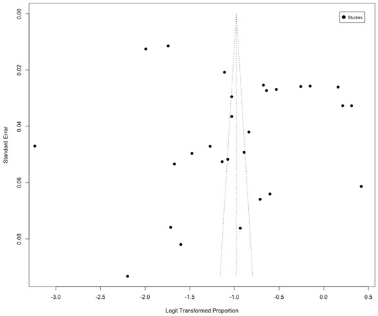 The overall pooled prevalence for sleep disturbance in Latin America was 24.73% (95% CI, 19.98–30.19; I2 = 100%) (Figure 2A). To decide whether to include all of the articles examining sleep disturbances or not, a publication bias chart was created. The results showed that publication bias was not significant (p = 0.059) (Figure 3).