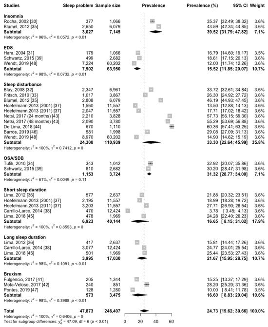 We divided eighteen papers into seven categories according to different types of sleep disturbances. The subgroup analysis was manipulated based on seven categories (Figure 4). The highest prevalence was for insomnia, with 39.52% (95% CI, 31.79–47.82; p < 0.01), and the lowest prevalence was for EDS, with 15.52% (95% CI, 11.85–20.07; p < 0.01). The overall pooled prevalence for sleep disturbance was 33.30% (95% CI, 22.64–45.99; p = 0) across eight articles [32,33,35,37,43,44,46,48]; for OSA/SDB, it was 31.32% (95% CI, 28.77–34.00; p = 0.11) across two articles [34,39]; and for bruxism, it was 16.60% (95% CI, 8.83–29.04; p < 0.01) across three articles [41,42,47]. The overall pooled prevalence for short sleep duration was 16.65% (95% CI, 8.15–31.02; p = 0) across four articles [36,37,38,45], and for long sleep duration, it was 21.67% (95% CI, 15.95–28.75; p < 0.01) across three articles [36,38,45].