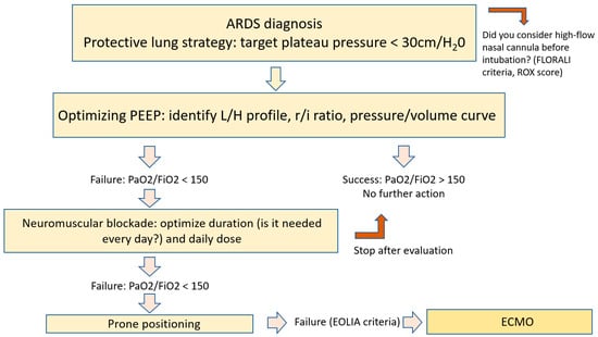 Proposed algorithm for a personalized ventilation strategy. ARDS, acute respiratory distress syndrome; L/H, low/high elastance; r/i ratio, recruitment to inflation ratio; ECMO, extracorporeal membrane oxygenation.