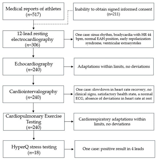 Five hundred sixteen medical reports of athletes included in the Olympic Team of Kazakhstan in various sports were examined. Demographic data are shown in Table 1. The mean age was 21.9 ± 2.98 years, 340 (65.9%) were male, and about four-fifths were Asians (78.1%). Athletes had the rank of master of sports, master of sports of international class, and candidates for master of sports with at least five years of experience in sports. Athletes were primarily engaged in power sports (35%); less than one-fifth were engaged in cyclic sports (17.6%), and even fewer athletes were engaged in complex coordination sports and shooting (8.1% and 9.3%, respectively). Due to the inability to obtain or refusal to sign informed consent, the data of 211 individuals was excluded from the analysis of subsequent tests. Due to problems with the extraction of medical data from the database, we could obtain access to TTE, cardiointervalography, and CPET data of 240 athletes. HyperQ stress testing was performed to identify the presence of diagnostically significant signs of ischemia in women athletes that represent non-cyclic-load sport types. HyperQ stress testing could only be carried out at a specific medical organization where the device is located (CARDIOVIT CS-200). HyperQ stress testing was performed for 18 athletes (artistic gymnastics, n = 9, and basketball, n = 9). The study design and the outcome of the cardiological functional assessment are illustrated in Figure 1.