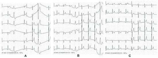 As an example, we give a clinical observation of an athlete, master of sports, age 23, sport type boxing, sports experience 13 years, male, height 182 cm, weight 78 kg, BMI 23.5 kg/m2. Based on the results of the PPCS, the athlete was allowed to participate in sports. He suffered a mild viral infection. Within two months, in connection with the upcoming international competitions, he began intensive training (two sessions a day, 1.5 h each, six times a week). An unscheduled 12-lead resting ECG test recorded ventricular extrasystole for the first time during intensive preparation for competitions. The ECG indicators were as follows: sinus rhythm, bradycardia with HR 44 bpm, normal EAH position, early repolarization syndrome, and ventricular extrasystoles (Figure 2A). During 24 h Holter ECG monitoring in the background of sinus rhythm (min 54 beats per minute, max 118 beats per minute), the following indicators were recorded: PVCs—17,209; trigymenia—110 cases; pauses of more than 2s—2 (max—2666 ms). The training regimen was revised, and The World Anti-Doping Code-approved cardio protectors were prescribed. Control 12-lead resting ECG indicated AV conduction at the upper limit of normal ranges, slowing of intraatrial conduction, and nonspecific ST-T changes (Figure 2B). Twenty-four-hour Holter ECG monitoring revealed the following: PVCs—12,338 per day (single monomorphic, including trigeminy type 35; supraventricular extrasystole—3 per day, single); no ST depression. Echocardiography results were as follows: chamber sizes and wall thickness were within normal ranges, systolic and diastolic functions were not impaired. The PWC 170 test revealed a low level of physical performance (1332 kgm/min), a maximum oxygen consumption of 36 mL/min/kg, and a hypertensive-type blood pressure response. The athlete was removed from training and referred for consultation with an arrhythmology specialist. The diagnosis was cardiac arrhythmia and idiopathic ventricular extrasystole. An electrophysiological examination was performed, involving radiofrequency ablation of the ectopic focus of extrasystole from under the right coronary cusp of the aortic valve using the CARTO navigation system. After complete recovery, 12-lead resting ECG indicated the following: sinus rhythm, irregular; HRmax—71; HRmin—62; vertical position of the electrical axis of the heart; AV conduction at the upper limit of normal ranges; slowing of the intraatrial conduction; nonspecific ST-T changes (Figure 2C). Twenty-four-hour Holter ECG monitoring indicated the following: sinus rhythm; average HR 65 (min 43, max 115); PVCs—0; single supraventricular extrasystoles—5; pauses—0. Currently, the athlete continues to perform successfully.