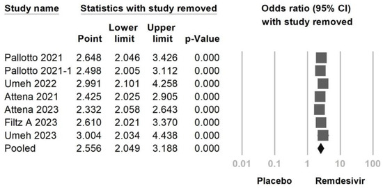 Sensitivity analysis of remdesivir-induced bradycardia associated with mortality utilizing the one study removed method [16,19,20,21,24,27].
