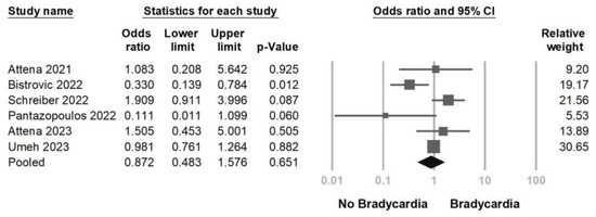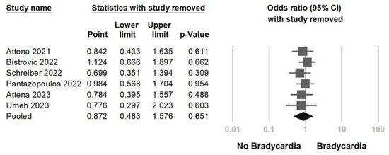Next, we aimed to investigate whether remdesivir-induced bradycardia was associated with a higher mortality than that in the non-remdesivir-induced bradycardia group. Six studies were included in this analysis (Figure 5), and the results indicated no significant difference between the two groups (OR = 0.872, 95% CI = 0.483–1.576, p = 0.651, I2 = 62.0%). A mild to moderate heterogeneity was observed. The sensitivity analysis, which involved the removal of one study, yielded consistent results (Figure 6). Egger’s regression did not indicate potential publication bias (p = 0.621) (Figure S1).