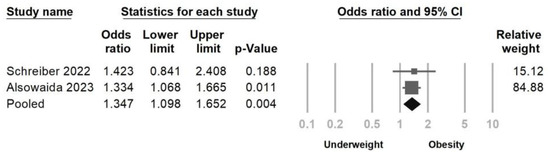Three studies were included to evaluate the impact of CKD, as shown in Figure 7. The findings revealed a significant association between CKD and remdesivir-induced bradycardia (OR = 1.251, 95% CI = 1.003–1.561, p = 0.047, I2 = 0.0%), with no observed heterogeneity. Additionally, Egger’s regression test (Figure 8) demonstrated no indication of publication bias (p = 0.364). Two studies were incorporated to assess the effect of obesity. The results indicated that patients with obesity were more likely to experience remdesivir-induced bradycardia (OR = 1.347, 95% CI = 1.098–1.652, p = 0.004, I2 = 0.0%, Figure 9).