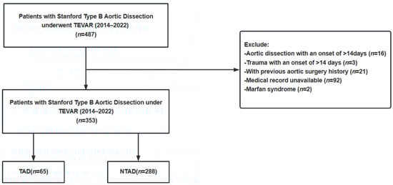 We conducted a retrospective analysis of 487 patients diagnosed with Stanford type B AD and treated with TEVAR at The First Hospital of China Medical University from January 2014 to December 2022. All the patients underwent computed tomography angiography (CTA) for diagnosis confirmation, with the general exclusion criteria being persistent symptoms > 14 days, unavailable medical records, history of aortic diseases, connective tissue disorders, systemic inflammatory diseases, and patients < 18 years old. Among the 487 patients, exclusions were made for patients with >2 weeks of symptoms (n = 19), a history of aortic surgery (n = 21), incomplete data (Imaging data of the aorta, n = 92), or Marfan syndrome (n = 2). Ultimately, 353 patients were enrolled and divided into the TAD and NTAD groups based on acute trauma history (65 in the TAD group and 288 in the NTAD group), as depicted in Figure 1. The study was conducted in accordance with the Helsinki Declaration and approved by the Ethics Committee of The First Hospital of China Medical University, at the same time, to uphold patient privacy rights, and all the patients were presented anonymously.