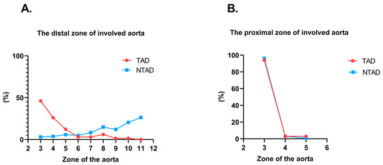 (A). Comparison of the distribution of distal involvement of aortic dissection between different zones of the aorta in two groups (p < 0.001). (B). Comparison of the distribution of proximal involvement of aortic dissection between different zones of the aorta in two groups (p = 0.228).