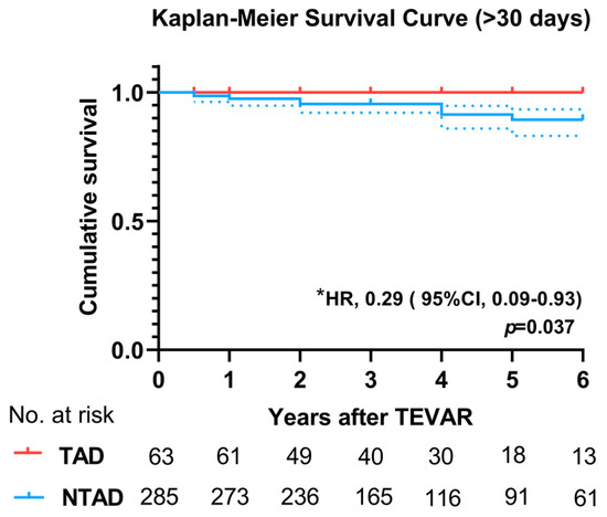 Kaplan–Meier survival curves for mid-to-long-term postoperative outcomes between the TAD and NTAD groups. Average follow-up time: 3.04 years in TAD, 3.33 years in NTAD. * The mid-to-long-term mortality rate in the TAD group is significantly lower than in the NTAD group.