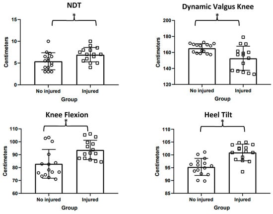 The t-test for independent samples showed statistically significant differences (p = 0.029) on NDT evaluation. Between groups (mean difference [CI 95%, t(df), ES]) was in favor of the injured group (1.52 [0.16–2.87, 2.30(28), 0.84]) in female basketball players. The effect size was categorized as moderate (0.08–1.58). The dynamic knee valgus t-test for independent samples showed statistically significant differences (p = 0.005). Between groups (mean difference [CI 95%, t(df), ES] was in favor of the uninjured group (−12.53 [−21.00–−4.05, −3.02(28), 0.84]) in female basketball players. The effect size was categorized as moderate (−1.86 to −0.32). Related to knee flexion, the analysis showed that statistically significant differences (p = 0.004) between group (mean difference [CI 95%, t(df), ES] high knee flexion values in favor of the injured group were found (10.78 [3.46–3.69, 3.11(28), 1.13]). The effect size was categorized as moderate (0.35–1.90). Finally, the t-test for independent samples showed statistically significant differences (p = 0.001) in heel tilt. Between-group (mean difference [CI 95%, t(df), ES] high tilt values in favor of the injured group were found (5.63 [3.17–8.08, 3.11(28), 1.71]) (see Figure 3). The effect size was categorized as large (0.86–2.54).