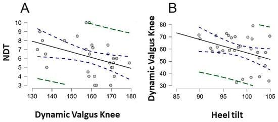 The graph illustrates the scatter plot between the dependent variables analyzed, (A) NDT—Dynamic Valgus Knee, (B) Dynamic Valgus Knee—Heel Tilt. Notes. Green marks show Prediction Intervals (95%). Blue marks show confidence intervals (95%).