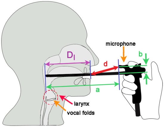 In order to interpret the recorded sound correctly, it is important to know the distance of the microphone from the mouth [7,8]. Wendler recommended setting this distance to 15 cm during laryngoscopy [9]; however, this recommendation has not been universally adopted. When the microphone is attached to the laryngoscope, or to the camera head mounted on the laryngoscope, the mouth-to-microphone (MTM) distance, d, cannot be set directly, because it depends on the depth of insertion of the laryngoscope into the mouth DI (Figure 1). Therefore, to determine the MTM distance, d, we need to measure it directly during the laryngoscopic procedure. This measurement normally requires three people to be involved (the examiner performing the laryngoscopy, the examiner performing the distance measurement, and the subject undergoing the rigid laryngoscopy). Such a measurement is doable but cumbersome and time-consuming to perform in clinical practice for every examined client.