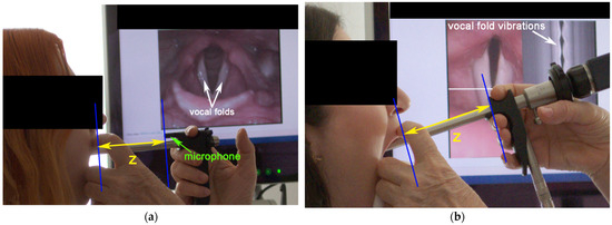 Side images obtained during (a) laryngeal stroboscopy (90° laryngoscope with an embedded microphone, L90S) and (b) videokymography (70° laryngoscope, L70K). The outside distance, z, was measured to derive the laryngoscope insertion depth into the mouth. Notice the monitor in the background showing the laryngeal images with the vocal folds—these were used for checking the correct placement of the laryngoscope in the mouth.