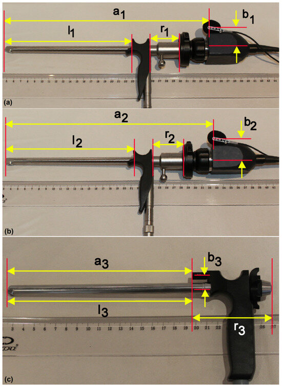 Examples of calibration photographs of the three rigid laryngoscopes used in this study: (a) L70K, (b) L90K, and (c) L90S. The lengths of the tubes, l1, l2, l3, and of the reference parts, r1, r2, r3, as well as the horizontal and vertical positions of the microphone from the tip of the laryngoscope (distances a1, a2, a3, and b1, b2, b3, respectively), were determined for the three laryngoscopes, respectively, using these photographs. The results are listed in Table 2. In (a,b), the microphone is fixed to the VKG camera head and covered by a protective acoustic foam; the location of the microphone inside the foam is indicated by the drawing. In (c), the microphone is embedded directly in the laryngoscope L90S.