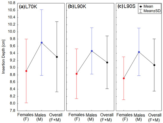 The insertion depth, DI, of different types of laryngoscopes for females (red), males (blue), and all adults (females plus males, black): (a) laryngoscope L70K, (b) laryngoscope L90K, and (c) laryngoscope L90S.