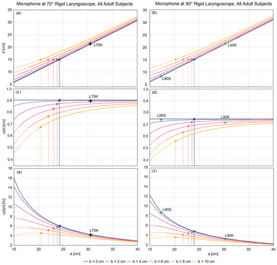 The average MTM distances, d, in males and their uncertainties u(d) for different microphone positions with respect to the tip of the laryngoscope (distances a and b indicated in Figure 1 and Figure 3). The results for the 70° laryngoscope are on the left (panels a,c,e) and for the 90° laryngoscope on the right (panels b,d,f). For the 90° laryngoscopes (right panels), the colored lines correspond to the pooled results from both laryngoscopes, whereas the crosses indicate the results for the two laryngoscopes (L90K and L90S) separately. (a,b) MTM distance, d; (c,d) uncertainty of MTM distance, u(d); and (e,f) relative MTM distance uncertainty, u(d)/d. Crosses indicate results for the specific locations of the microphones used in this study. Dots indicate the standard MTM distance of 15 cm recommended by Wendler [9] for different values of a and b.