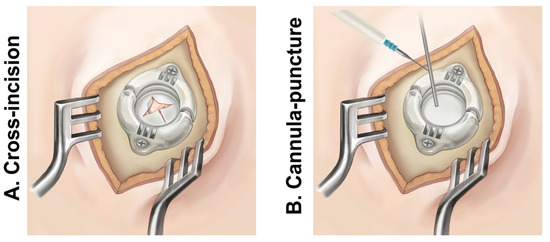 Two methods of opening the dura. (A) Opening the dura via cross-incision. (B) Opening the dura via cannula puncture with the assisted of monopolar coagulation.