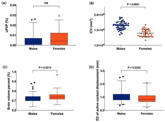 Sex differences in preoperative brain structure and postoperative electrode displacement. Data with non-normal distribution are presented as box plots (median (25th and 75th percentiles)). Data with normal distribution are presented as scatter plots (mean ± standard deviation). (A) No difference was found in the uPVP between sexes. (B) The ICV of males was larger than that of females. (C) Males had more severe brain atrophy than females. (D) Males had a greater ED of contact displacement than females. uPVP: unilateral pneumocephalus volume percent; ICV: intracranial volume; ED: Euclidean distance; ns: no significance.