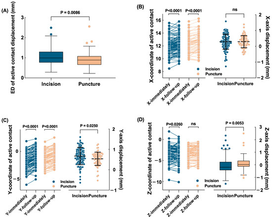 Differences in electrode displacement between the cross-incision group and cannula puncture group. Data with non-normal distribution are represented with box plots (median (25th and 75th percentiles)). Data with normal distribution are represented with scatter plots (mean ± standard deviation). (A) The ED of active contact displacement was greater in the cross-incision group than that in the cannula puncture group. (B) The X-coordinate of the active contact was more lateral in the follow-up period in both groups. No difference in X-axis displacement was found between the two groups. (C) The Y-coordinate of the active contact was more anterior in the follow-up period in both groups, but the Y-axis displacement was greater in the cross-incision group. (D) Z-axis displacement was found in the cross-incision group but not in the cannula puncture group. ED: Euclidean distance; ns: no significance.